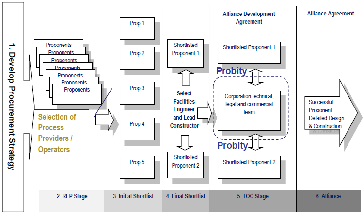 As with most infrastructure projects, the Southern Seawater Desalination Project had unique features that needed to be incorporated into the RFP, for example, Water Corp used a two part alliance; a D&C Alliance and an Operations Alliance. Moreover, Water Corp used a progressive NOP selection process, selecting first the Operator and then collectively (the Operator and Water Corp) selecting the D&C Participants. This serves to highlight the complexity of many infrastructure projects and the need to tailor the RFP to the specific project.