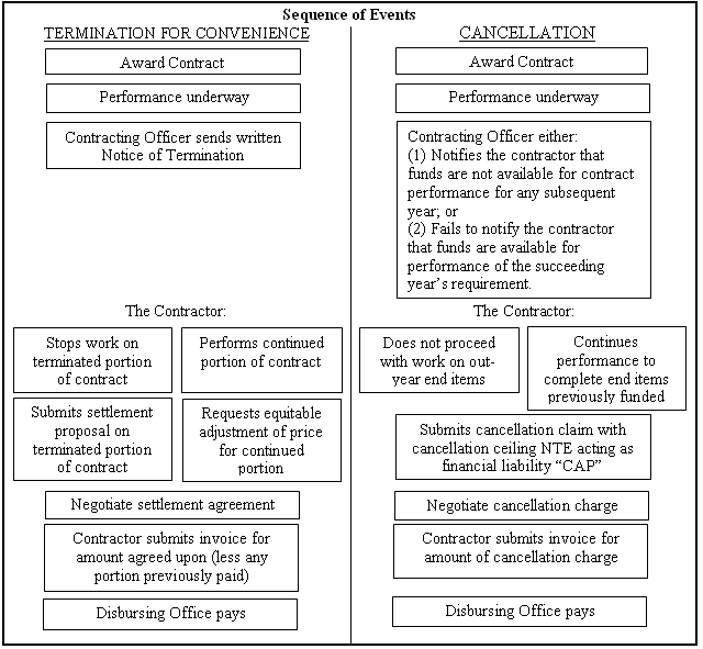 (1) Cancellation seems similar to termination for the convenience of the Government. It is a unilateral action taken by the contracting officer when the Government needs to end a contract before it is completed. When a multi-year contract is canceled, the sequence of events is very similar to that following a termination for convenience. This is shown in Figure 5.A. There are significant differences, however, between cancellation and termination for convenience. These differences are included as part of the reason for cancellation or termination and are summarized in Figure 5.B.