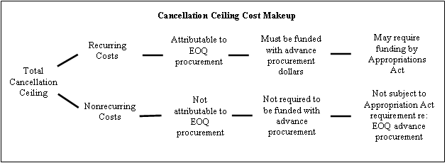 (B) A cancellation ceiling may consist of two kinds of costs: nonrecurring costs and recurring costs. Any recurring costs are attributable to the advance procurement (i.e., long lead and/or EOQ) being done under the multi-year contract. The EOQ procurement must be funded with advance procurement dollars. This is illustrated as follows: