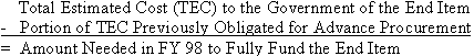 (iii) In the XYZ Satellite example, one end item is being acquired in FY 98. It must be fully funded in FY 98. This means you should obligate the amount that results from the following calculation: