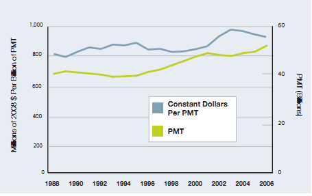 | Another way to look at the federal share of transportation spending is in terms of capital spending only (i.e., excluding spending on maintenance and operations), since nearly all federal funding is for investment in capital projects. The federal share of total highway capital investment has ranged from 16 percent (in the first year of the HTF) to just over 50 percent in the mid-1980s. As illustrated in Exhibit 2-6, the federal contribution to highway capital spending was 44 percent in 2006, close to the long-term average of about 45 percent. Of the 56 percent non-federal share in 2006, about 34 percent represents state-level investment and about 24 percent represents capital spending by lo- cal governments.8 The federal share of transit capital investment grew rapidly from 1962 through the early 1980s, when federal funding accounted for much of the capital investment in mass transit. Federal funding for transit capital has declined since then, averaging close to half of total capital investment since the late 1980s, and was about 44 percent of the total in 2006.9
