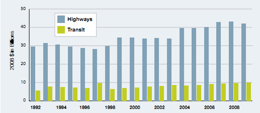 Over the last 15 years, Congress has consistently increased authorizations for HTF spending. These budget authorizations provide the basis for future obligations (commitments) and outlays (expenditures). Exhibit 2-11 shows that from the first year of the Intermodal Surface Transportation Efficiency Act (ISTEA, 1992) to the final year of SAFETEA-LU (2009), federal highway budget authorizations increased by 46 percent and federal transit budget authorizations increased by 85 percent in 2008 dollars. (Note that a portion of federal transit spending is funded from the General Fund instead of the HTF—about 15-20 percent in recent years.) The apparent 17-year growth largely disappears, however, when adjusted for the increases in vehicle and passenger miles traveled. After accounting for the overall growth | |||