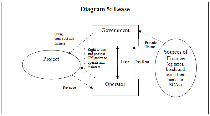 Under the lease structure, the government finances and constructs the infrastructure asset. On completion, the government maintains the ownership of the infrastructure, but contracts out to the private sector the operation, management and maintenance of the infrastructure assets. The private operator is entitled to the revenues generated from the ownership of the infrastructure asset.