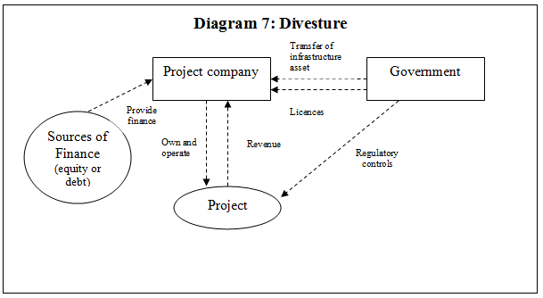 Divesture, or privatisation, involves the government selling or transferring its infrastructure assets so that the private sector owns, manages and operates the infrastructure. The government may control the way in which the infrastructure services is provided through regulation, or through control of the licensing procedures.