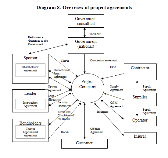 Diagram 8 below contains an overview of the PPP project at the national level. Each of the solid arrows and dotted boxes represent agreements to be discussed below. For projects that do not involve a separately incorporated project company, the contracting party for the project company should be replaced by the party that owns or has the right to operate the infrastructure asset.