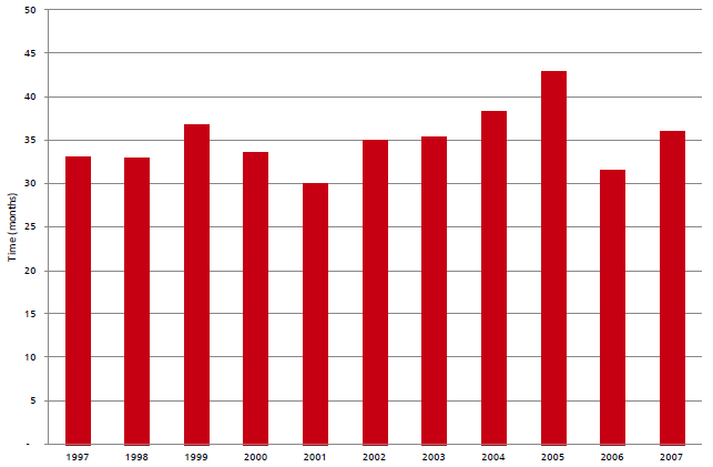 3.3 Average PFI procurement times, from initial project tender to financial close, have stubbornly remained at around 35 months. This average has, however, varied by sector; the average procurement time for schools was 22 months in 2008 whilst in sectors such as housing and waste procurement times have consistently been significantly longer.