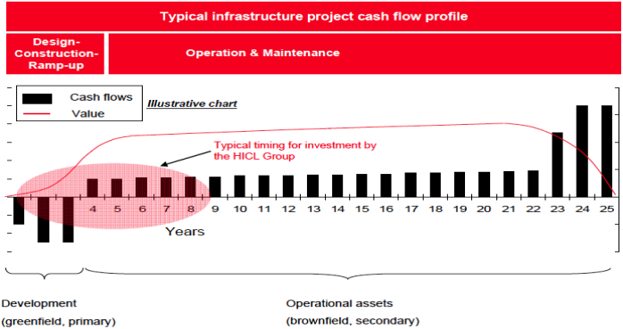 The financing of PPP projects is complex. The HICL Infrastructure Company Limited example below illustrates cash flows over the contract period. The negative cash flows in the first three years reflect the cost of financing construction followed by positive cash flows once the project is operational. It concludes with a short period before the end of the contract with a significant increased cash flow to the SPC.