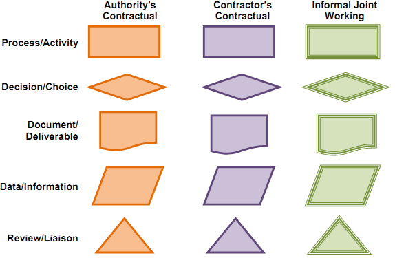 - These working practices should be mapped into the process flow diagram created under Step 2B, but should be separately colour coded to ensure that there remains clarity as to each party's contractual roles and responsibilities, see the example below: