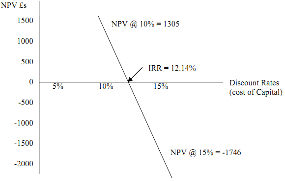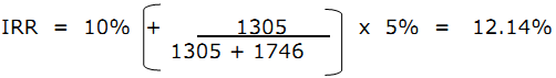 In using Linear Interpolation for estimating the IRR, we have assumed a linear relationship between interest rates and NPV. In fact, the relationship is NOT linear. If we were to calculate the NPVs for the project using a large number of interest rates and then plot these NPVs on a graph, we would produce a curve. The relationship is, in fact, curvilinear. Thus, by using linear interpolation to estimate IRR, we have taken a short-cut across the curve, with the result that the estimate of IRR is slightly too high. In the above calculation, we have used interest rates of 10 % p.a. and 15 % p.a. - a range of 5 %. Had we used a larger range (say, by using interest rates of 9 % p.a. and 16 % p.a. - a range of 7 %), the effect of the "short-cut" would have been greater and the error in estimating the IRR would, thus, be greater. In practice, so long as the range of interest rates selected is not too high, the above method of estimating IRR is sufficiently accurate for most purposes. In practice, a computer program or a programmable calculator would eliminate this estimation error.