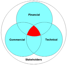 23. Issues can be allocated generically according to subject matter. They may be technical, financial, commercial/legal or partnering issues. They will more than likely overlap and those tasked with taking forward their resolution need to be mindful that resolving a given issue in a "silo" is not likely to have achieved resolution at all. The graphic below represents the key interfaces that will be of concern to the IPT and the other main players - an issue can only be deemed fully resolved if the individuals at the centre of these overlapping circles (on all sides) have reached agreement. Paragraph 53, for example, looks at the pivotal importance of the financial model and key assumptions in negotiations - it is clear from the graphic below that work done on the model needs to be understood in the context of the commercial and technical spheres of the project.