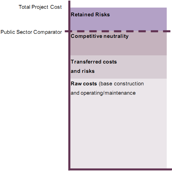 The concept of the PSC is illustrated in the diagram below. The dashed line represents the value of the PSC. It excludes the value of retained risks and costs because these are not passed to the private sector and would therefore not be priced in a tender:
