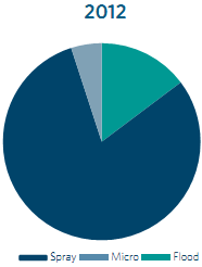 Also shown in the 2012 results of the Statistics New Zealand Agricultural Production survey, is a shift to more water-efficient irrigation schemes. Flood systems have decreased from 18% to 13%, conversely, more efficient spray and micro systems have increased.