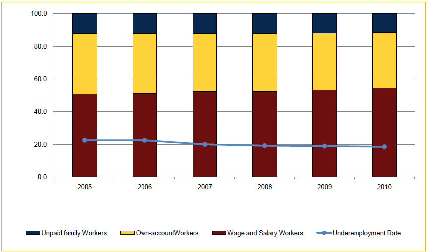 Figure 2.8 Employment by Class of Worker and Underemployment Rate, 2005-2010 (in percent)
