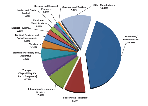 From 1995 to 2010, investments in enterprises located inside PEZA-registered economic zones came mostly from the electronics/semiconductor industry. Locators from the electronics/semiconductor sector contributed 42.88 percent of total investments in the ecozones. Following this was the basic metal/mineral industry (9.29%); information technology services (7.69%); transport (shipbuilding, car part, equipment) (6.78%) and electrical machinery and apparatus (5.46%). These comprise the top five sectors garnering the largest number of investments over the past 15 years of PEZA's existence (Figure 3.2).