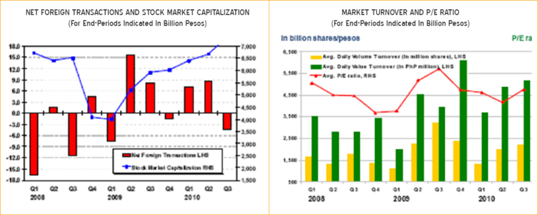 The country's stock market also showed signs of recovering from depressed global market sentiments in 2007-2009 particularly during the worst period of the U.S. subprime crisis in 2008. The Philippine Stock Exchange index (PSEi) surged 37.6 percent to close at 4,201 points at end-year 2010, the fourth biggest annual percentage increase in the last ten years.
