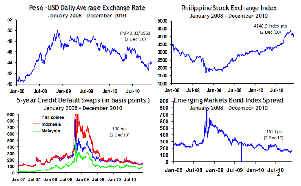 Also, figure 6.6 summarizes the performance of Philippine financial markets post crisis and improved investor sentiment as evidenced by the general strengthening of the peso against the US dollar, rebound of the domestic equities market and tightening of sovereign debt spreads.