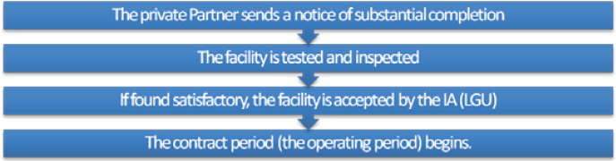 Conditions of commissioning are the clauses and specifications that define when the facility shall be completed and considered operational. LGUs should use clear and unequivocal language in the contract, specifying the following: (1) the term "substantial completion," (2) project milestones, (3) target completion date based upon meeting the requirements of substantial completion, (4) operating parameters, and (5) specifications which the completed facility must adhere to. The procedure for determining substantial completion is particularly critical. The general procedure starts with the issuance of a notice of substantial completion by the private partner and ends when the concession period begins, as illustrated in Figure 2-8.