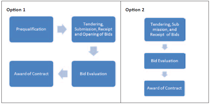 In option 1, prequalification is undertaken prior to the issuance of request for proposals while in option 2 it is incorporated in the tendering step and followed by submission and receipt and opening of bids. In short, option 2, the qualification documents are simultaneously submitted together with the technical and financial proposals. The figure below illustrates the procurement process for options 1 and 2.