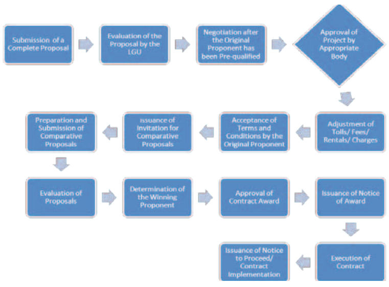 | EVALUATION OF THE PROPOSAL | If proposal is complete, LGU evaluates the project proposal and advises the proponent in writing, 30 cd, whether it accepts or rejects the proposal. Acceptance gives the proponent the "original proponent" status. The LGU shall inform the Approving Body of its decision to accept or to reject the unsolicited proposal. In case of acceptance, the LGU submits to the Approving Body all pertinent documentation. |