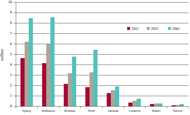 Our four largest cities - Sydney, Melbourne, Brisbane and Perth - are projected to grow by 5.8 million (or around 45%) from 12.8 million in 2011 to 18.6 million in 2031. Areas around these cities - the Hunter, Illawarra, Gold Coast, Sunshine Coast and Geelong regions - are expected to grow from 2 million in 2011