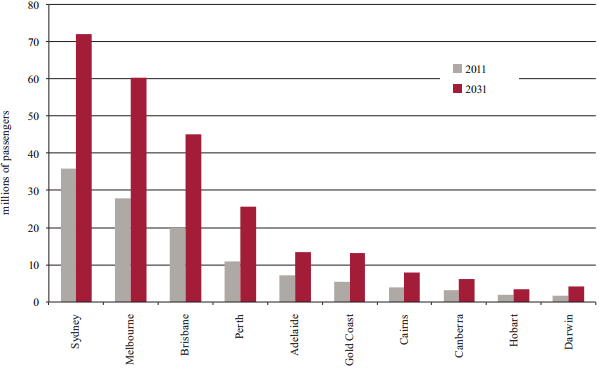 Demand for airport services is expected to approximately double between 2011 and 2031. Australia's 10 busiest airports handle more than 80 per cent of total passenger traffic. Over the next 15 years, air travel demand will double and additional capacity will be required in Sydney, Brisbane, Perth and Melbourne. Funding this will require continued investment from private sector operators. Meanwhile some smaller airports are likely to need government funding support.