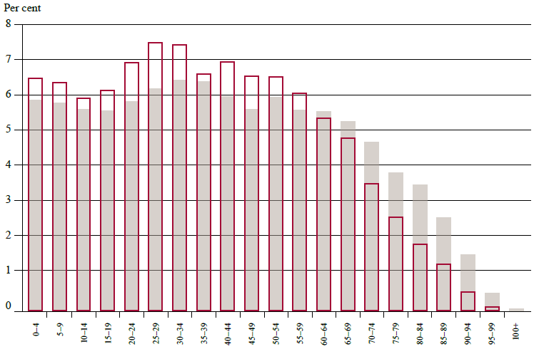 The number of people aged 65 or older is projected to increase by 77 per cent between 2012 and 2031, from 3.2 million to 5.7 million. The population as a whole is set to grow by 34 per cent over the same period. Consequently, the ratio of those aged 18 to 64 (i.e. working age) to those aged 65 and older is projected to drop from 4.5 in 2012 to 3.2 in 2031.120
