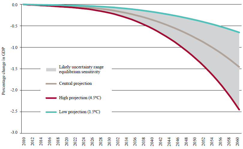 Organisation for Economic Cooperation and Development (OECD) modelling indicates that climate change may have a detrimental impact on future GDP growth. Figure 17 shows that annual GDP losses of between 0.7 and 2.5 per cent globally could be expected by 2060, with the greatest detrimental impact from decreased agricultural productivity and rising sea levels.