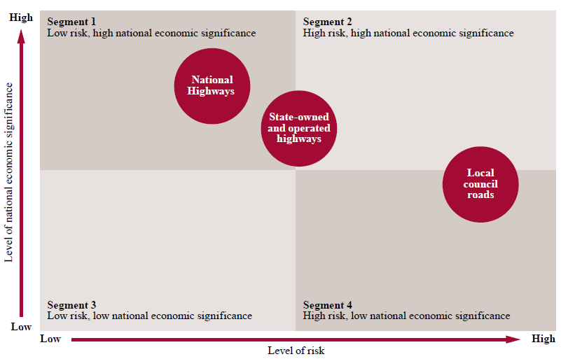 The most economically significant roads are the national highways and major state arterial roads. These roads have high traffic volumes, and handle large numbers of trucks and other commercial vehicles. There is evidence of a maintenance deficit across many of these roads in all jurisdictions.