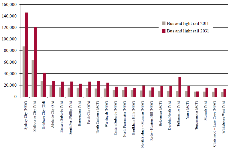 Figure 28: Top 20 bus and light rail destinations nationally by passenger hours travelled (PHT) per day in 2011 and projected for 2031