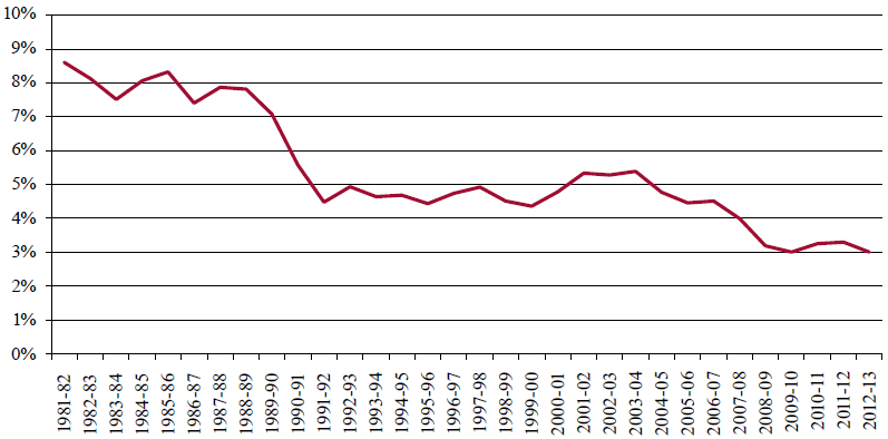 Figure 32: Annual growth in interstate and intrastate road freight - 10-year moving average - 1981-82 to 2012-13