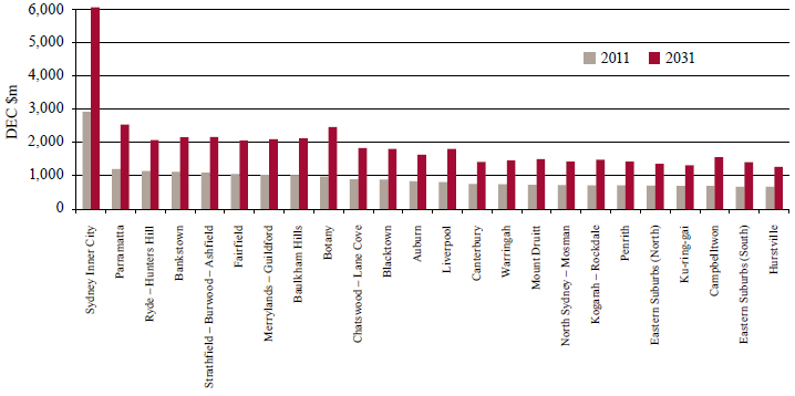 Figure 50: Trips in Sydney-Newcastle-Wollongong by origin/destination for roads and public transport in 2011 and 2031, measured by DEC ($ million)