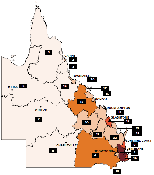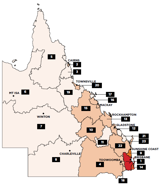 | 1 Greater Brisbane 2 Cairns N+S 3 Cairns Hinterland 4 Darling Downs - Maranoa 5 Far North 6 Outback-North 7 SWQld_NA 8 SWQld 9 Sunshine Coast 10 Central Highlands (Qld) 11 Gladstone - Biloela 12 Gladstone - Biloela_NA 13 Rockhampton 14 Gold Coast 15 Bowen Basin - North 16 Mackay 17 Whitsunday 18 Toowoomba 19 Charters Towers - Ayr - Ingham 20 Townsville 21 Bundaberg 22 Wide Bay 23 Hervey Bay |