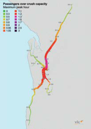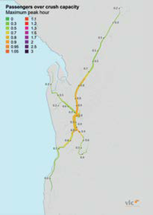 Figure 95: Adelaide rail network weekday passenger demand relative to crush capacity (2011)