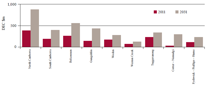Figure 102: Trips in Canberra by origin/ destination for roads and public transport in 2011 and 2031, measured by DEC ($ million)
