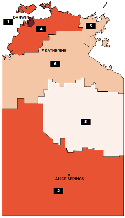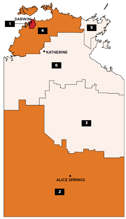 1 Darwin 2 Alice Springs 3 Barkly 4 Daly - Tiwi - West Arnhem 5 East Arnhem 6 Katherine | ||