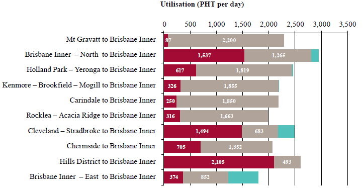 Figure 76 sets out the top 10 public transport O/D pairs in Brisbane-Gold Coast-Sunshine Coast by passenger hours travelled (PHT), and by public transport mode. Inner Brisbane is comfortably the largest O/D in the city, and is serviced by mix of rail, bus and ferry travel.
