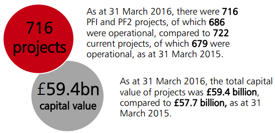 2.1 The chart above shows the number of projects within the governments PFI and PF2 portfolio and their total capital values. The difference in total number of projects from last year is due to two projects reaching financial close1, one project being added due to a previous technical omission, one project being removed due to being cancelled and eight projects removed due to reaching the end of their contract period. Please see tables below for more information.