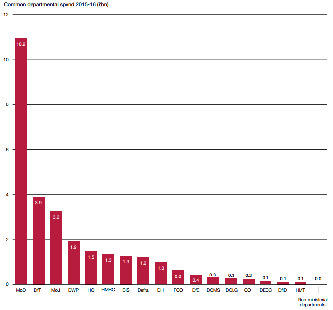 1.4 In 2015-16 central government departments spent around £29 billion in areas that could, in theory, be considered common goods and services (Figure 1). The Ministry of Defence is the largest buyer, followed by the Department for Transport and the Ministry of Justice. CCS estimates that around one-third of this amount is appropriate to be bought centrally. This is because some common goods (such as information technology) can be strategically important, operationally complex or bespoke and departments want to manage these purchases themselves.