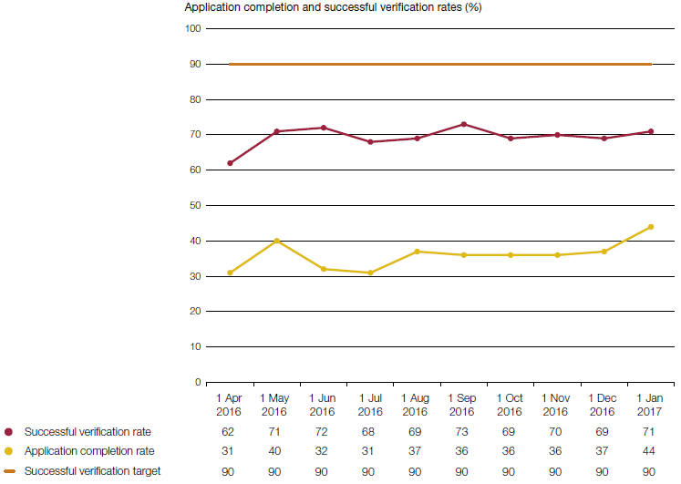 4.28 Adoption of Verify has been impeded by problems experienced by users and services. Citizens are not always able to register with the commercial providers due to lack of online 'proof' of identity. Data show that a significant number of users drop out before they submit a full application to verification providers. Providers' performance in verifying applications successfully is below the 90% target set out in the September 2015 business case (Figure 14 overleaf).