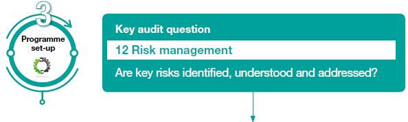 | Sub-questions Has the programme adopted a systematic approach (for example, horizon scanning) to identifying and considering risks? Have foreseeable risks been identified and assessed? Have risks been appropriately analysed to assess both the likely occurrence and the potential impact and produce a prioritised management strategy? Have key risks been allocated an owner and a management plan in place? Are there systematic criteria for escalation? Have risks associated with using innovative approaches/solutions been taken into account? What contingency plans are in place and how would they be activated? | ||