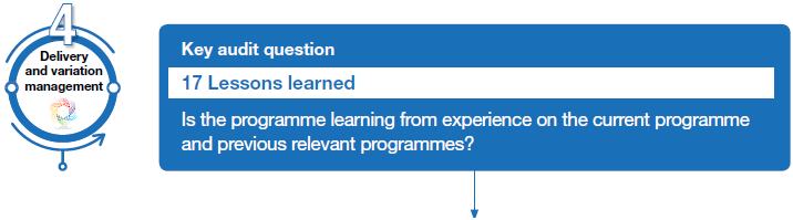 | Sub-questions If the organisation has attempted similar programmes, has it avoided repeating any mistakes made in those programmes? Is there evidence of learning from programme performance information? What caused deviations from plan (over/under-runs)? Are these likely to re-occur/knock-on in subsequent stages? | ||