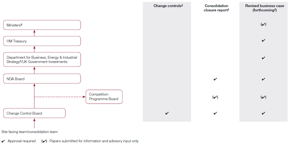 Notes 1 In May 2015 the Chancellor of the Exchequer announced the creation of UKGI to replace the Shareholder Executive. In July 2016 the Department for Business, Energy & Industrial Strategy took on the responsibilities of the former Department of Energy & Climate Change, including sponsorship of the NDA. 2 The NDA will submit a revised business case for the contract once it agrees the terms of termination with CFP. It would have also been required to submit a consolidation closure report, if consolidation had been concluded. 3 Approval or endorsement is required from ministers at the Department and HM Treasury. Scottish Government ministers are informed through the CPB. Source: National Audit Office analysis |