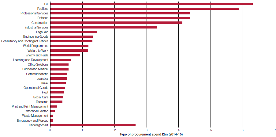 3 The figures shown are for 2014-15 outturn except for 'HMT & HMRC' where the 2015-16 budget figure is used because the HMT PESA outturn figure is negative, due to the financial sector interventions. 4 As the Cabinet Office's spend analysis tool does not cover the NHS, the figure shown for purchase of goods and services by "NHS & DH" has been estimated by adding the 2014-15 WGA figure for the NHS to the Department of Health figures from the spend analysis tool. | 5 The DCLG PESA figure includes the administration of DCLG and funding for delivering departmental responsibilities such as housing, planning and regeneration policy. 6 The expenditure data from the Cabinet Office's spend analysis tool is provisional and has not been validated with departments. We published similar analysis for 2012-13 in our 2013 report managing government suppliers. |