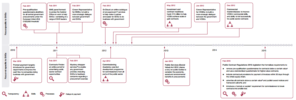 Notes 1 Currently £111,676 in central government and £172,514 outside central government. 2 £10,000 for central government and £25,000 for other public bodies. 3 The mystery shopper service is available to any government provider and therefore provides partial SME focus. Source: Meetings with the Crown Commercial Service and the Office for Civil Society |