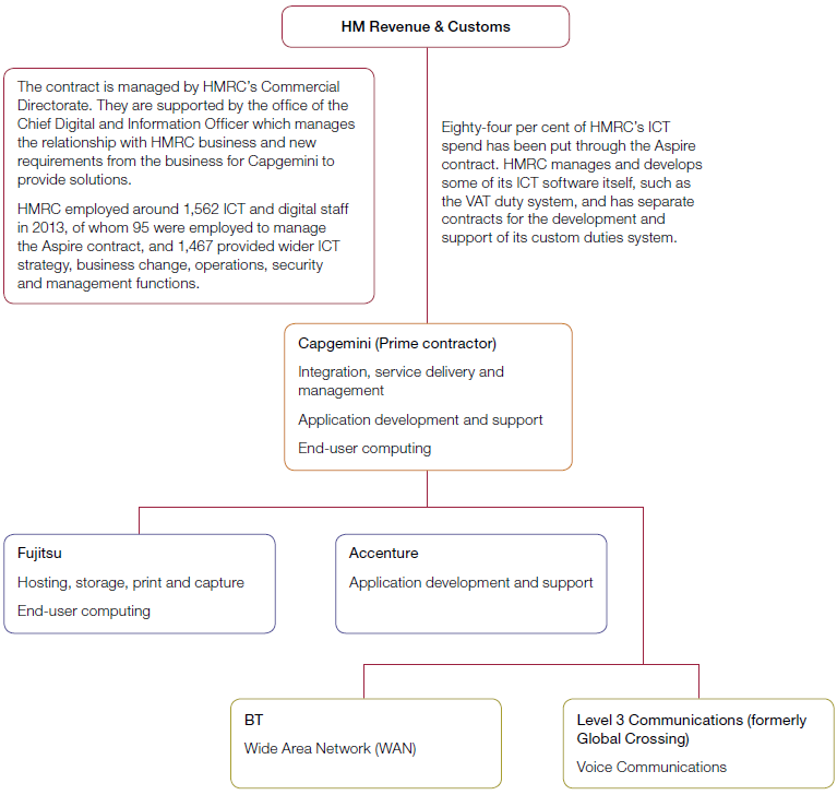 1.10 Aspire is a 'prime supplier' contracting model (Figure 1) through which HMRC contracts solely with Capgemini. Capgemini provides all services and has two main subcontracts: one with Fujitsu (worth £2.8 billion from July 2004 to March 2014); and one with Accenture (worth £0.3 billion in the same period).