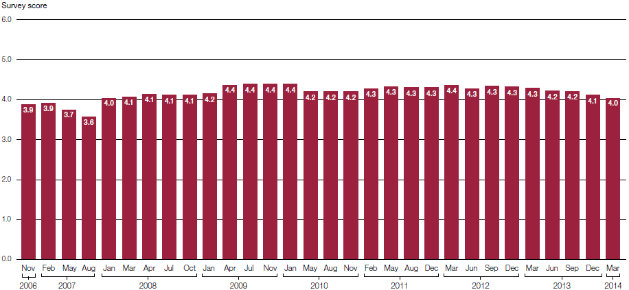 2.17 Staff and management have been reasonably satisfied with the Aspire service. HMRC randomly surveys around 5 per cent of its staff each quarter to measure satisfaction with Aspire. The results are reported on a scale of one to six (where six is good) and show that staff satisfaction has fluctuated within a fairly narrow band between 3.6 and 4.4 (Figure 7).