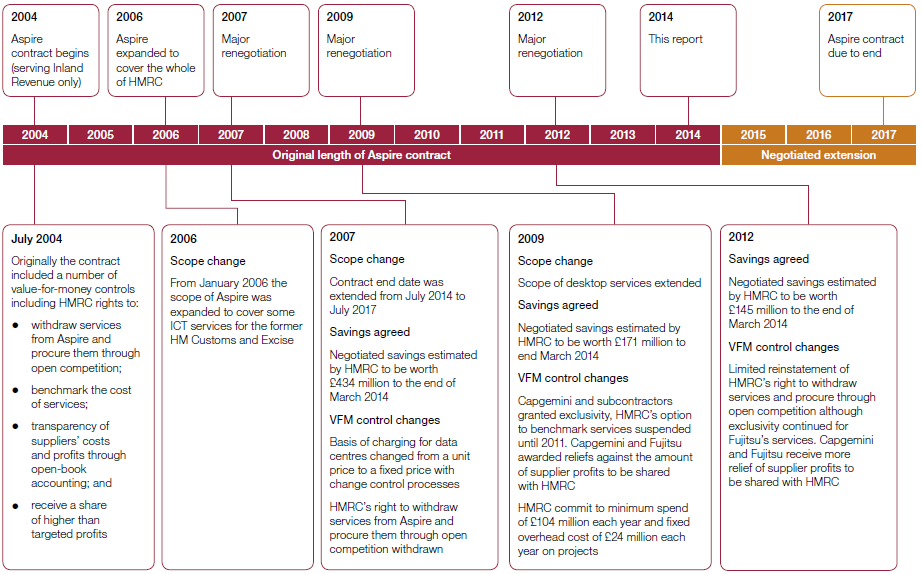 3.3 Since 2004, HMRC has done four major and 121 minor contract renegotiations.20 One aim in renegotiating the contract was to reduce prices, in response to financial pressures and reductions in technology prices. Through these negotiations, HMRC and Capgemini agreed to change the Aspire contract, including: