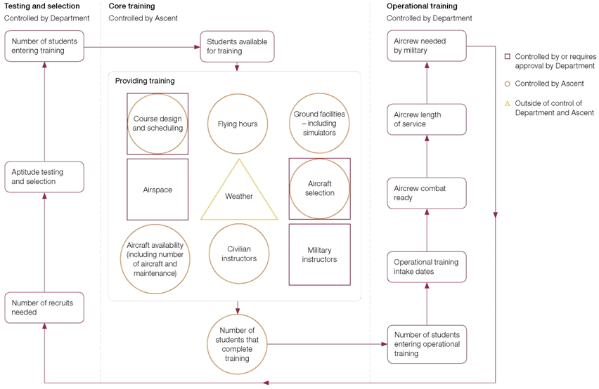2.8 To achieve the benefits of the new core training, the Department must understand the factors that affect flying training, their relative impact and who can best control them. It must also understand the risks it has transferred to Ascent. The Department has faced issues during the implementation of advanced jet training that demonstrate the challenge of combining military and industry involvement in core flying training.