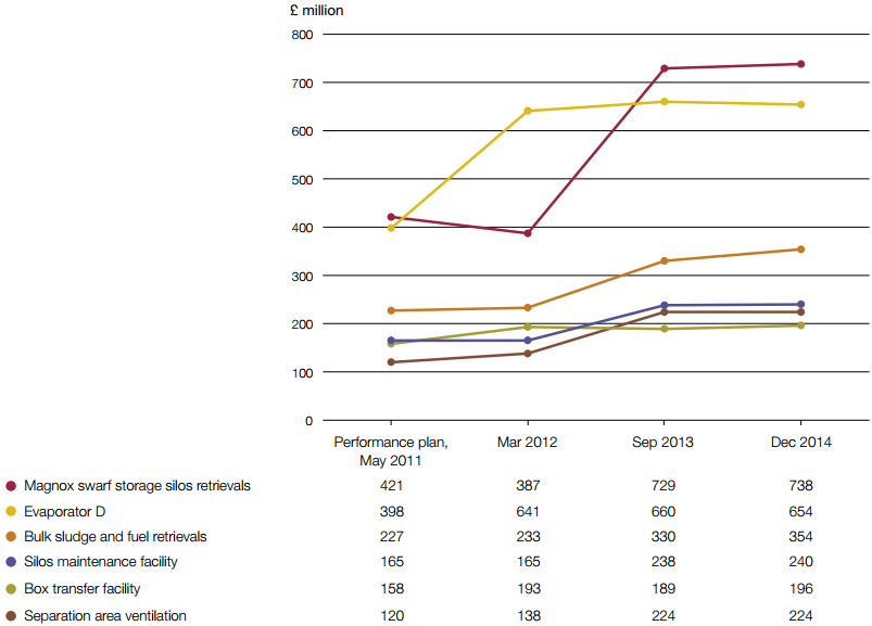 2.16 Since September 2013 the estimated costs for most of the original remaining major projects have been stable, for projects in both the planning and design and construction phases (Figure 7 and Figure 8). However there has been a substantial increase of £1.4 billion in the lifetime cost for the silos direct encapsulation plant, a complex treatment plant in the planning and design phase.7 This has resulted in the total lifetime costs of the remaining nine major projects increasing to around £7 billion. In addition, one new project - the box encapsulation plant project - has gone into the design phase. This project has been accelerated in order to accept waste from the magnox swarf storage silo ahead of the availability of the silos direct encapsulation plant. The Authority estimates that this project will cost around £492 million.