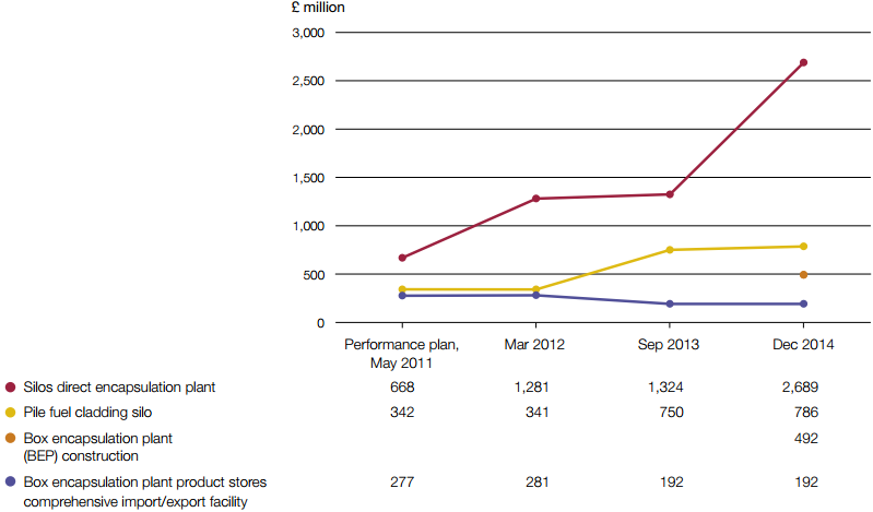 2.17 The estimated cost of the silos direct encapsulation plant has doubled from £1.3 billion in September 2013 to £2.7 billion in December 2014 (Figure 7). In 2012 we reported that this is the third attempt to design a plant to receive, treat and immobilise the waste from the magnox swarf storage silo. At that time Sellafield Limited was planning to recompete the project. Since awarding the contract Sellafield Limited has confirmed its cost estimate with greater certainty, but has moved its expected completion date back from August 2020 to June 2026. This project has accounted for the majority of the overall extension to completion dates for major projects.